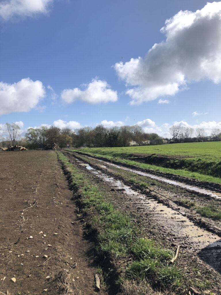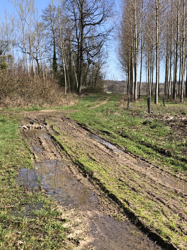 Chemin de la prairie, vers la Vieille Saône, les inondations récentes n’ont pas arrangé la situation. On tient à peine debout dans ce bourbier. Tous ces chemins ne sont pas prévus pour supporter le passage répété de tels engins.